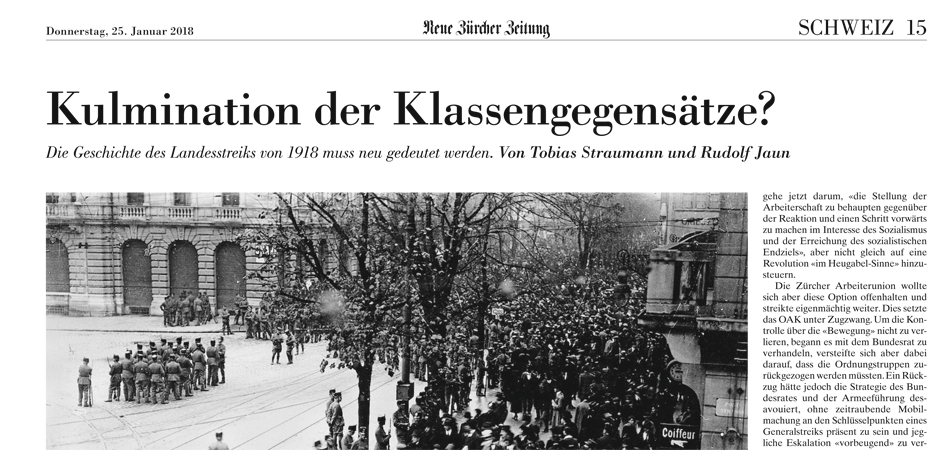 Unter dem Titel Kulmination der Klassengegensätze? fordern Prof. Dr. Tobias Straumann und Prof. Dr. em. Rudolf Jaun in der NZZ eine Neudeutung der Ereignisse von 1918. Die damalige Lebensmittelknappheit scheint ihnen überbewertet im Vergleich zu den “Ängste(n), welche die russische Revolution und der russische Bürgerkrieg in bürgerlichen Kreisen auslösten.”