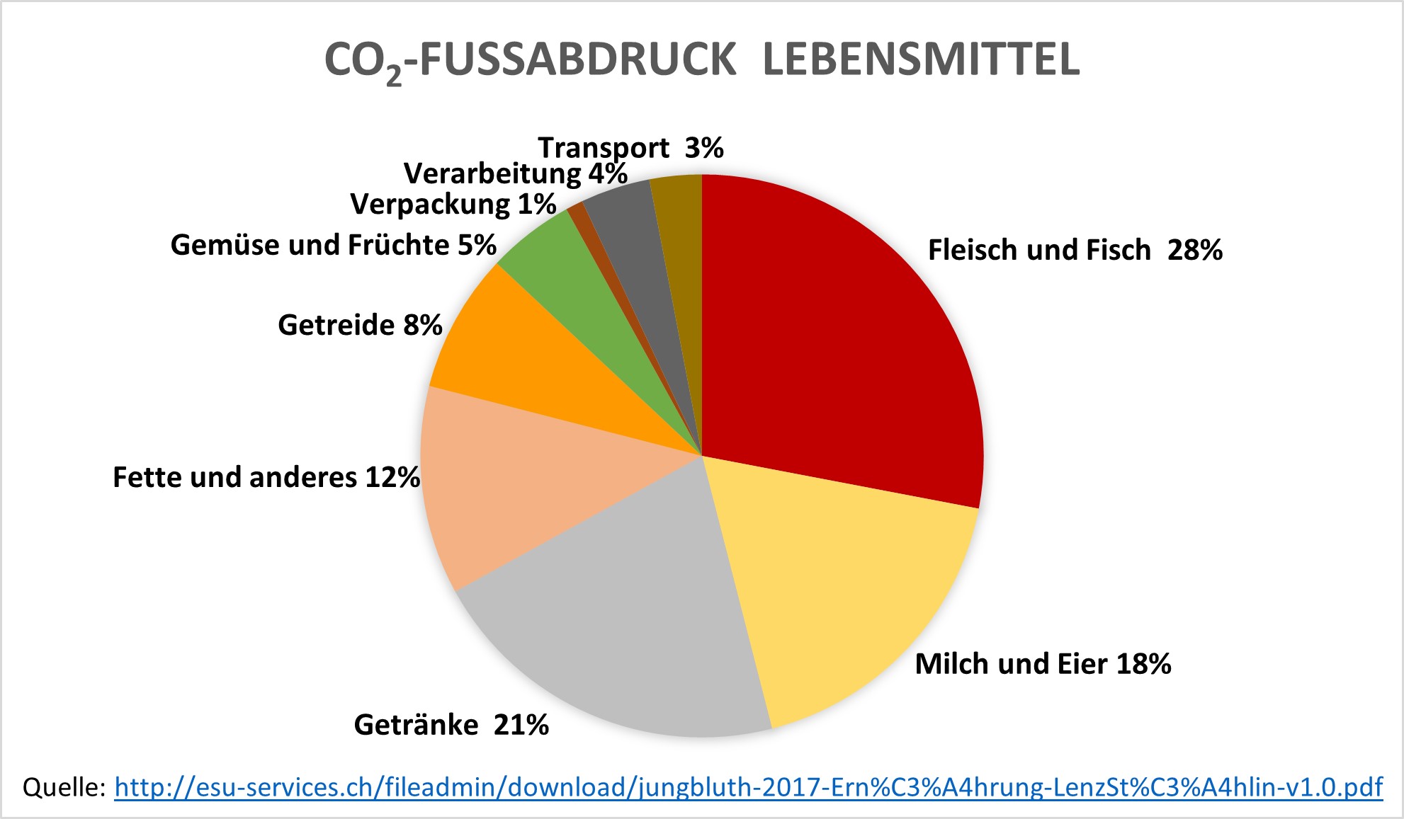 Fleisch und Fisch haben die grössten klimarelevanten Emissionen (28% des Totals), dann kommen gleich die weiteren tierischen Erzeugnisse (Milch und Eier, 18%) und Getränke (21% – besonders umweltintensiv sind neben Kaffee alkoholische Getränke). Früchte und Gemüse haben einen relativ kleinen Anteil am Umweltabdruck der Ernährung.