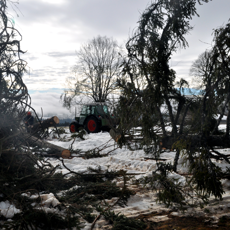 Winterstürme 2018 Anfangs Januar brausten 3 grosse verheerende Stürme über die Schweiz: Burglind, Evi und Friederike. Schöne Namen – grosser Schaden. 5 Bäume, grosse Rottannen lagen erschlagen auf unseren Waldweiden.
