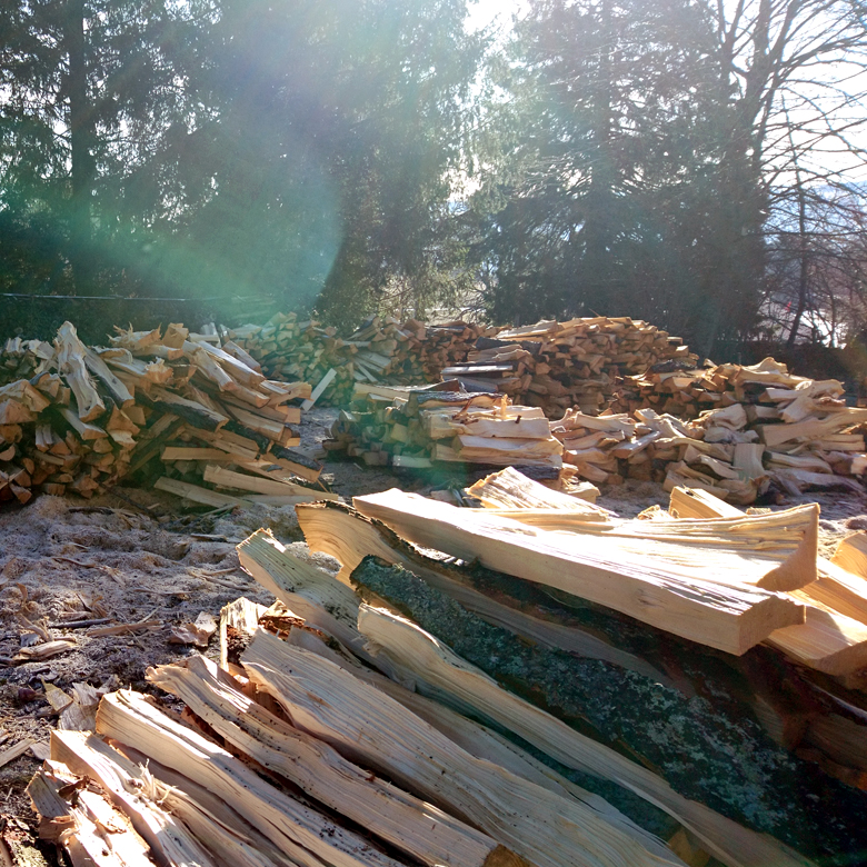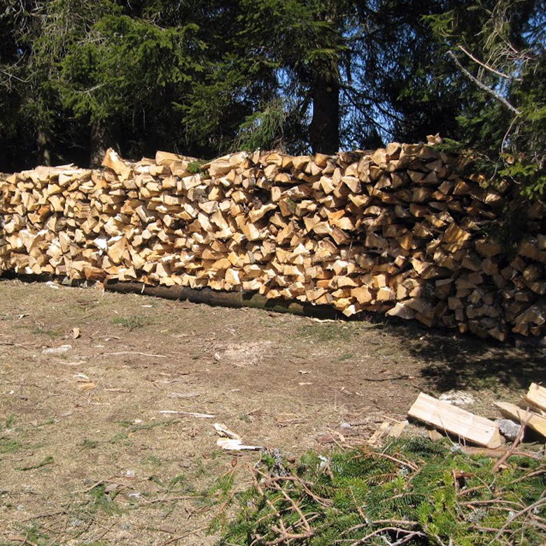 Meterstücke gespaltenIn mehreren Tagen wurden dann die Meterstücke mit einer grossen hydraulischen Spaltmaschine aufgespalten. Meter für Meter. Eindrückliche Biegen von Holzscheitern lagen nun auf der vorderen Waldweide.