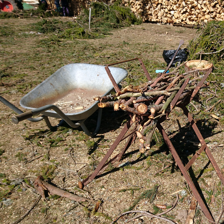 Auch der Bürdelibock kam zum Einsatz: Nebst den Meterstücken aus den Stämmen haben wir auch die Äste zu Bürdeli, auch Wällen genannt, verarbeitet.