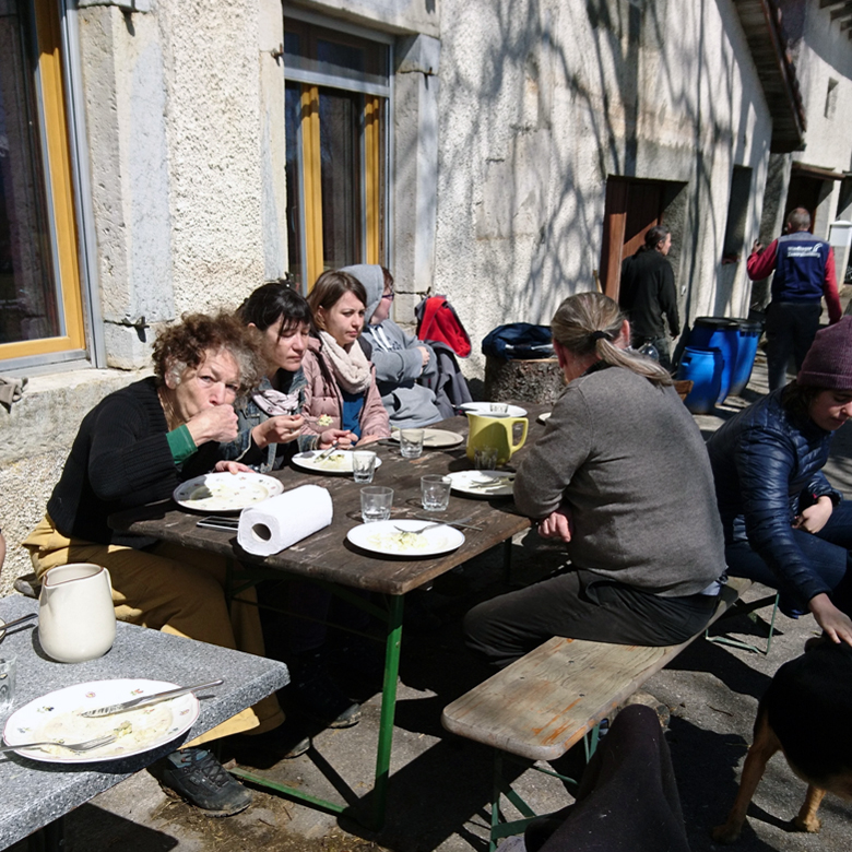 Gutes Essen für hungrige HelferInnen.Bei schönstem Sonnenschein konnten wir das feine Essen, das Vincent für uns gekocht hat, geniessen. „Ein grosses Merci an alle, die mir geholfen haben das Sturmholz aufzuräumen. Holz gibt mehrmals warm, jetzt habe ich sicher für die nächsten Jahre genug Brennholz!“