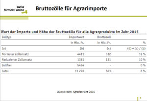 Die Schweiz importiert jährlich für 11 Milliarden Lebensmittel. Etwa die Hälfte davon kommt zollfrei, wie Palmöl, Zucker. Im Durchschnitt werden darauf 6% Zoll erhoben:In MERCOSUR gehört die Landwirtschaft zur Wirtschaft. Deshalb ist eine weitverbreitete „gesamtwirtschaftliche Sicht“ die, dass es sinnvoll sei, unseren Markt für ihre landwirtschaftlichen Produkte zu öffnen und dafür Zugang auf den MERCOSUR Markt erhalten für unsere Exportwirtschaft.