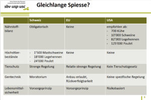 Im internationalen Freien Markt gelten unterschiedlichste Regulatoren und Bedingungen. In der Schweiz muss jeder Betrieb nur schon um Direktzahlungen zu erhalten eine Nährstoffbilanz erstellen, während man in den USA keine verbindlichen Regeln habe in dem Bereich. Ein anderes Beispiel sind Höchsttierbestände, die bei uns tiefer sind als in den umliegenden Ländern. Zum Beispiel darf ein Betrieb in der Schweiz höchstens 18‘000 Legehennen haben. In Deutschland hat der Durchschnittsbetrieb über 30’000 Legehennen. Wie können wir mit diesen Rahmenbedingungen am internationalen Markt mitmachen?