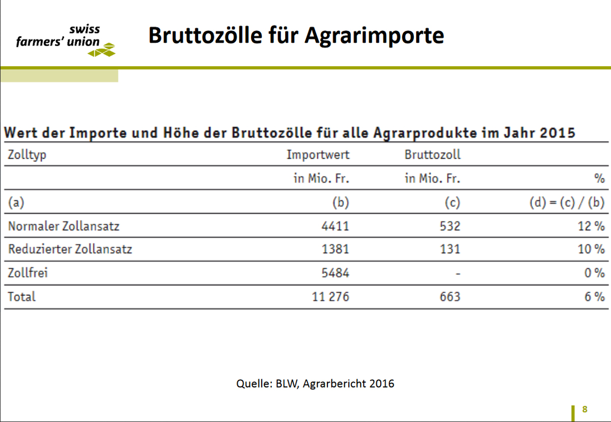 Die Schweiz importiert jährlich für 11 Milliarden Lebensmittel. Etwa die Hälfte davon kommt zollfrei, wie Palmöl, Zucker. Im Durchschnitt werden darauf 6% Zoll erhoben:In MERCOSUR gehört die Landwirtschaft zur Wirtschaft. Deshalb ist eine weitverbreitete „gesamtwirtschaftliche Sicht“ die, dass es sinnvoll sei, unseren Markt für ihre landwirtschaftlichen Produkte zu öffnen und dafür Zugang auf den MERCOSUR Markt erhalten für unsere Exportwirtschaft.
