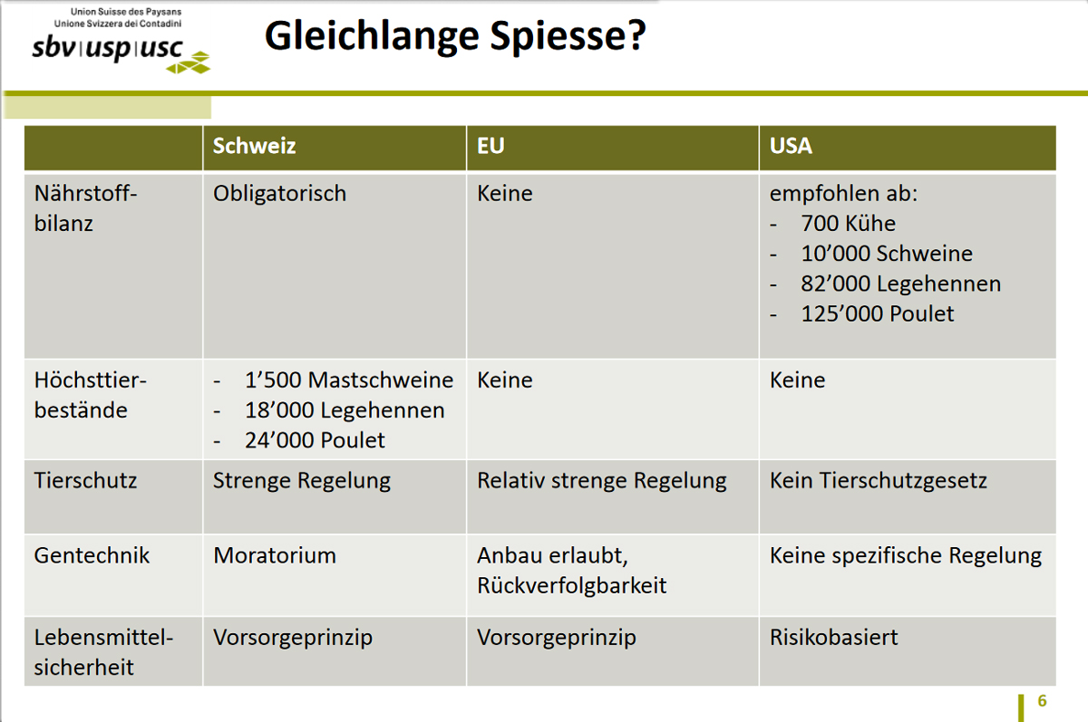 Im internationalen Freien Markt gelten unterschiedlichste Regulatoren und Bedingungen. In der Schweiz muss jeder Betrieb nur schon um Direktzahlungen zu erhalten eine Nährstoffbilanz erstellen, während man in den USA keine verbindlichen Regeln habe in dem Bereich. Ein anderes Beispiel sind Höchsttierbestände, die bei uns tiefer sind als in den umliegenden Ländern. Zum Beispiel darf ein Betrieb in der Schweiz höchstens 18‘000 Legehennen haben. In Deutschland hat der Durchschnittsbetrieb über 30’000 Legehennen. Wie können wir mit diesen Rahmenbedingungen am internationalen Markt mitmachen?