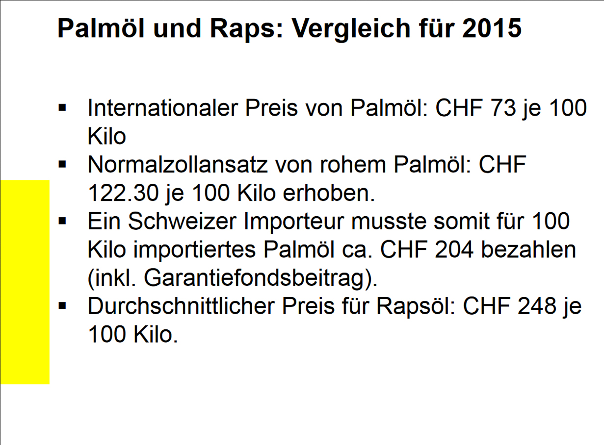 Beispiel Palmöl: der Weltmarktpreis liegt bei CHF 73.-/100kg. Das Schweizer Rapsöl (Die Sorte HOLL-Raps wurde extra für ihr hitzestabiles Öl gezüchtet) hat einen 100kg-Preis von 248.-Fr. und ist gegenwärtig durch einem Importzoll von CHF 116.- je 100kg Palmöl einigermassen konkurrenzfähig (Folie 10 →).