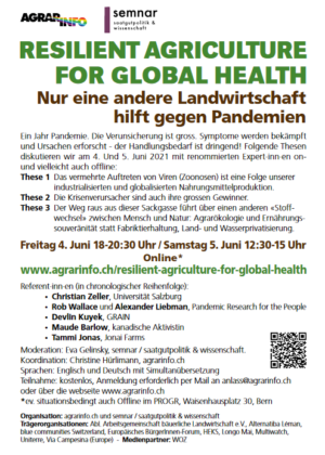 In unserem Vortrag werden folgende Themen behandelt: Racial Capitalism, auf dem die Plantagenlogik gründet, der gestörte Stoffwechsel zwischen Mensch und Natur und die negativen Skaleneffekte, die neue Infektionskrankheiten verstärken – von der molekularen bis zur planetaren Ebene. Wir beschreiben, welchen Schaden die industrialisierte Nahrungsmittelproduktion und kapitalistische Ausbeutung der Natur bei der Bekämpfung von Krankheiten grundsätzlich anrichten. Wir werden mit einer Diskussion darüber schliessen, wie und warum die Agrarökologie – als agronomische Praxis, soziale Bewegung und Wissenschaft – eine Form der Lebensmittelproduktion darstellt, in der die Lebensgrundlagen erhalten werden und in der sich eine dekoloniale Wissensproduktion und radikale politische Kämpfe verbinden. Würde die Agrarökologie breit angewandt, könnte sie entscheidend zur Verhinderung weiterer Ausbrüche von Infektionskrankheiten beitragen.