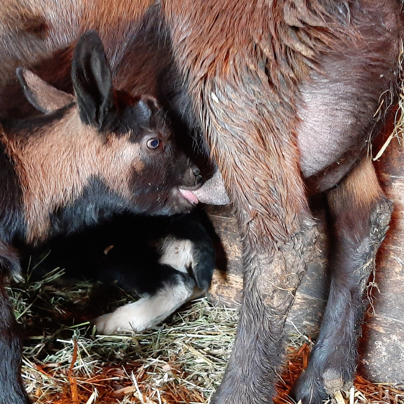6 Monate müssen die Kälber mindestens Milch erhalten. Hier trinken sie Milch bis sie im Juni von den Müttern getrennt auf die Alp gehen. Für einen Stier fehlt der Platz, die Kühe werden, wie auf den meisten Höfen, künstlich besamt. Für die Ziegen gibt’s einen Bock.